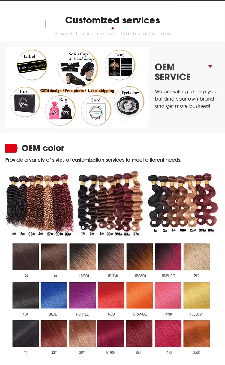 Natural Straight, Body Wave, Deep Wave, Water Wave, Kinky Curl etc. Providing any styles product according to customer's product picture or sample.